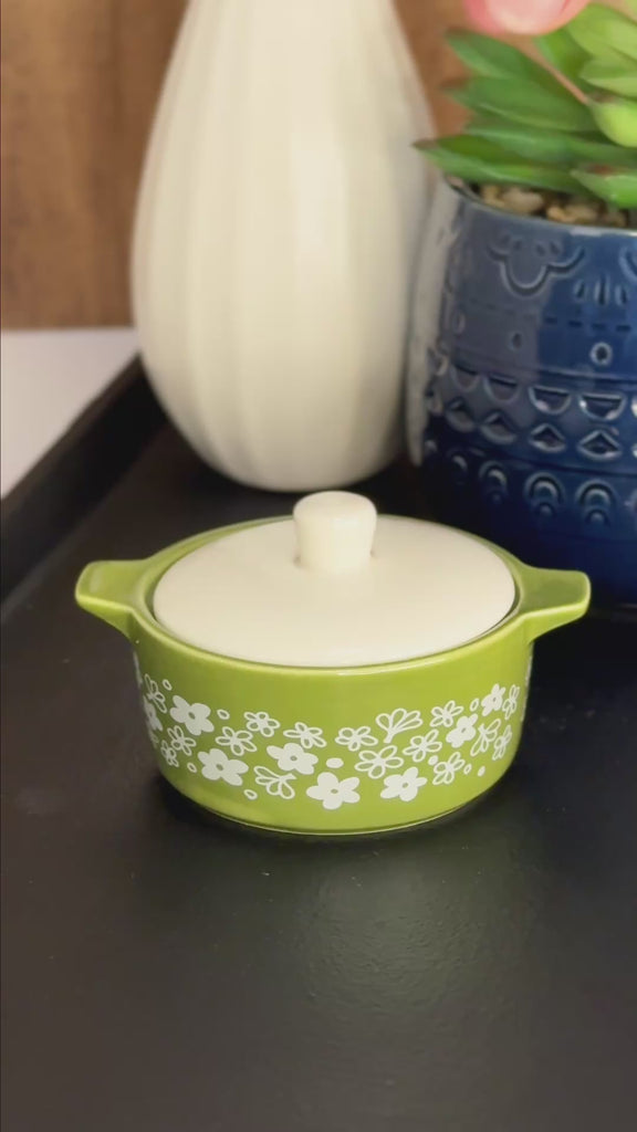 Inspired by the beloved vintage Pyrex Spring Blossom (Crazy Daisy) casseroles that once brightened vintage kitchens, this ceramic trinket box turns everyday nostalgia into something you can hold in your hands. Finished in an avocado green glaze and topped with a charming white lid, it captures that unmistakable Pyrex-inspired warmth in a tiny, giftable size.